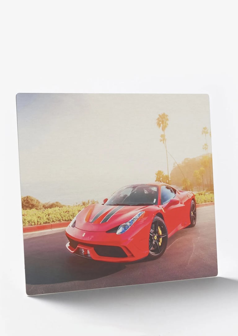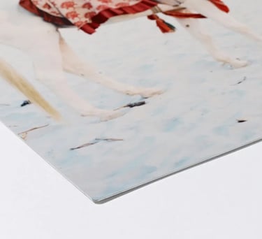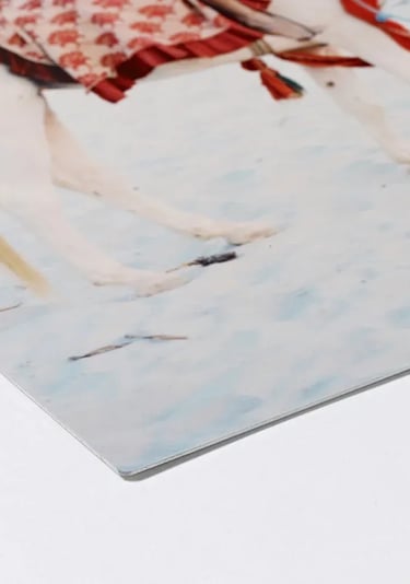 The high-gloss finish of our aluminum prints serves a functional, as well as aesthetic, purpose. The clarity of the specialized coating allows light to pass through the pigment and reflect off the white base-coat of the aluminum.